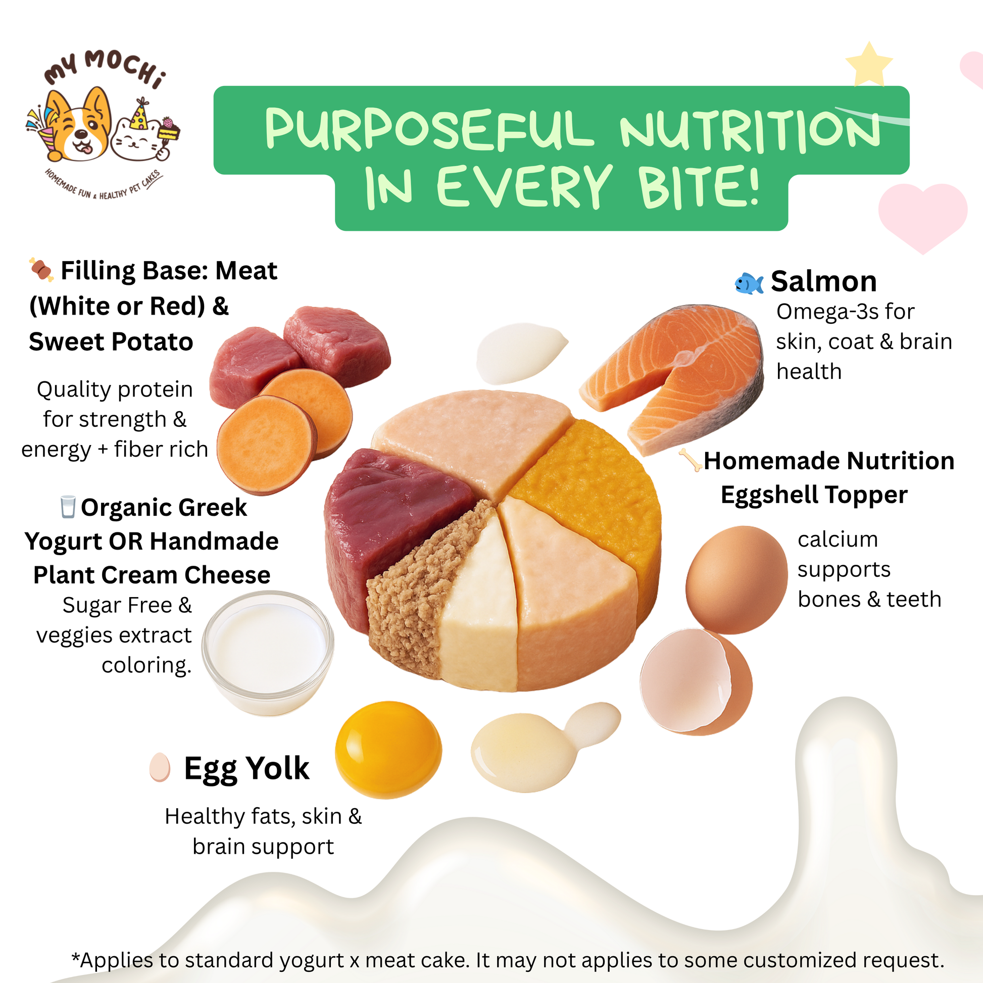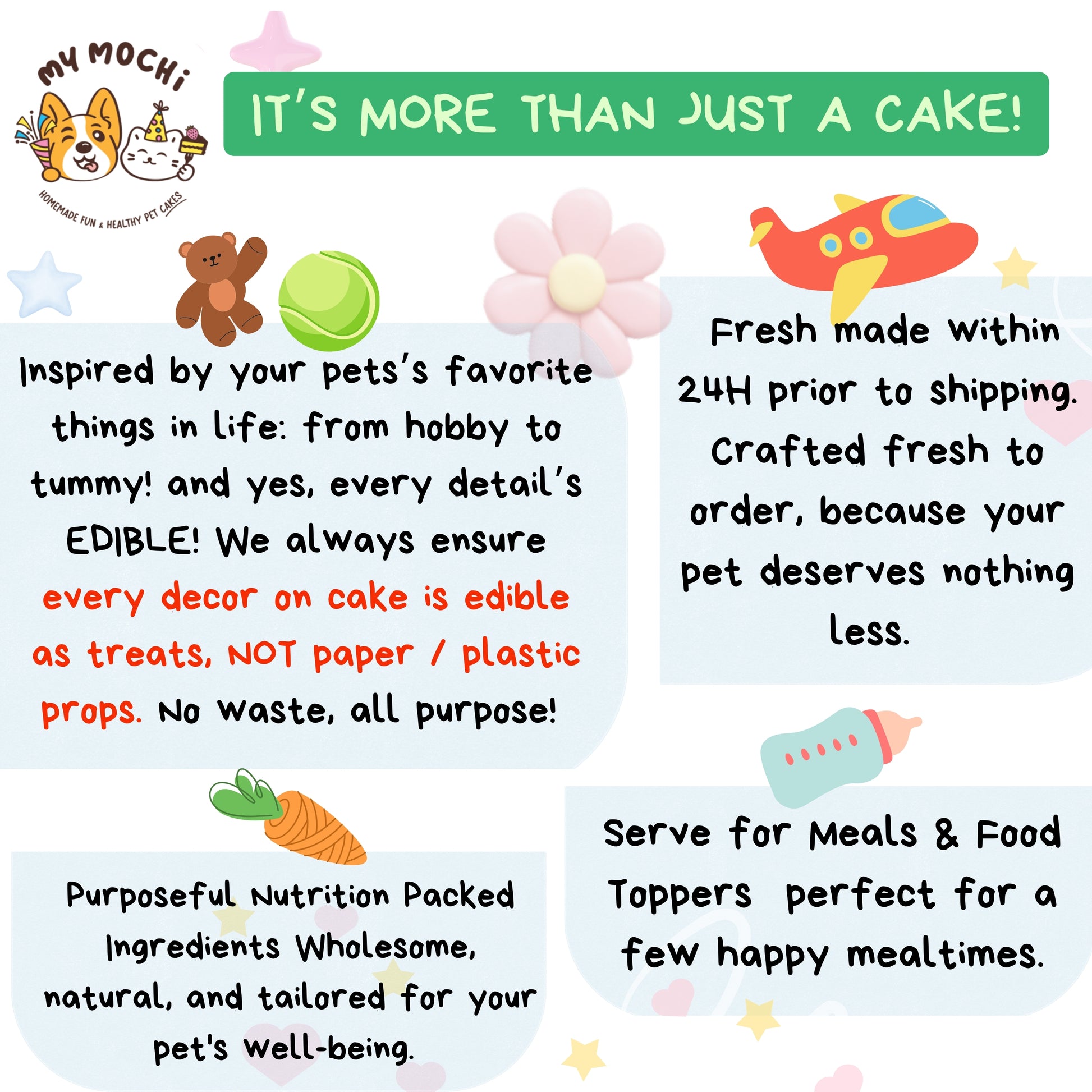 Who Says Yummy Can’t Be Nutritious? Unlike conventional pet cakes, all MyMochi cakes are thoughtfully handcrafted with care.